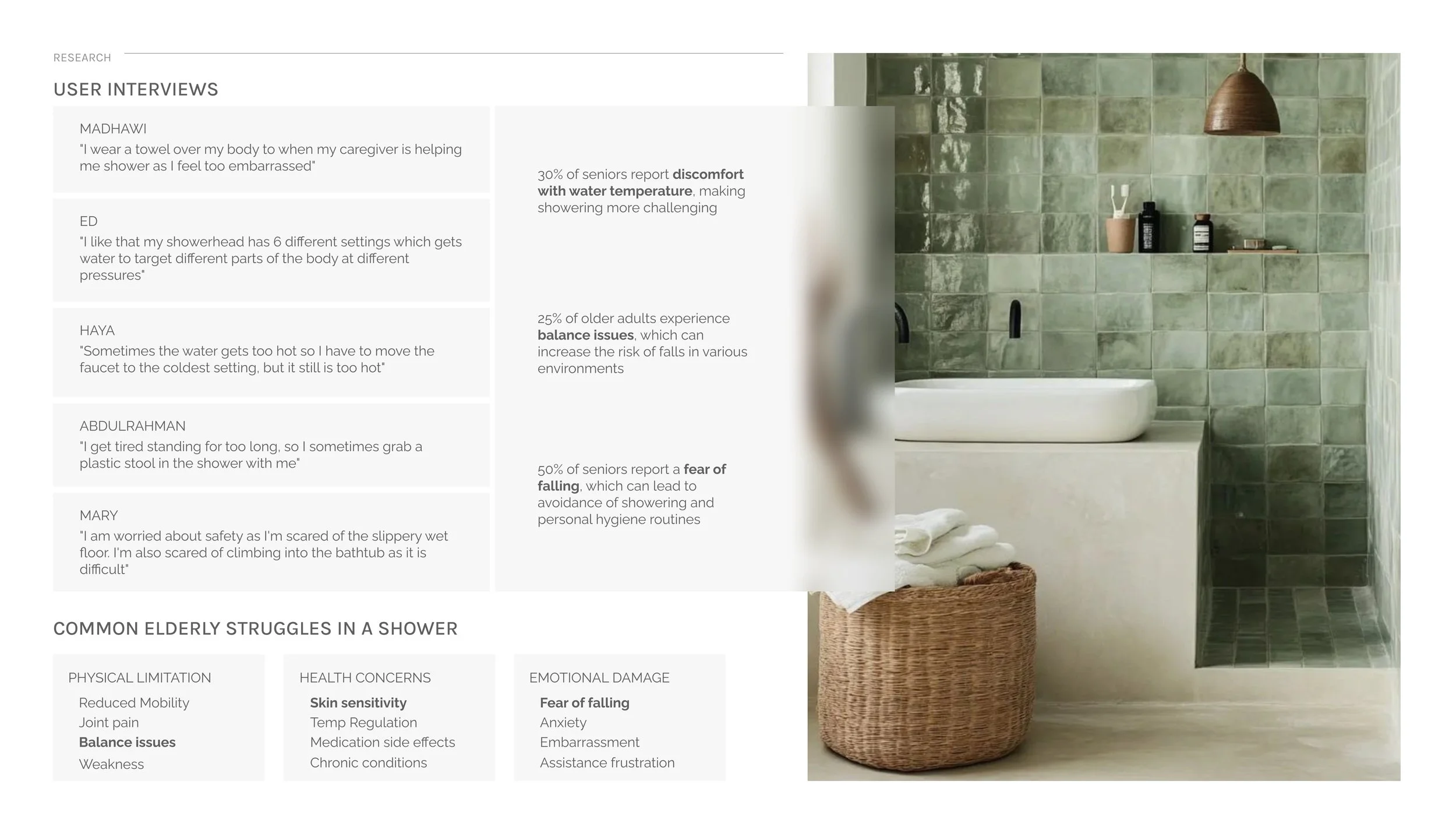 "I am worried about safety as I'm scared of the slippery wet floor. I'm also scared of climbing into the bathtub as it is difficult"