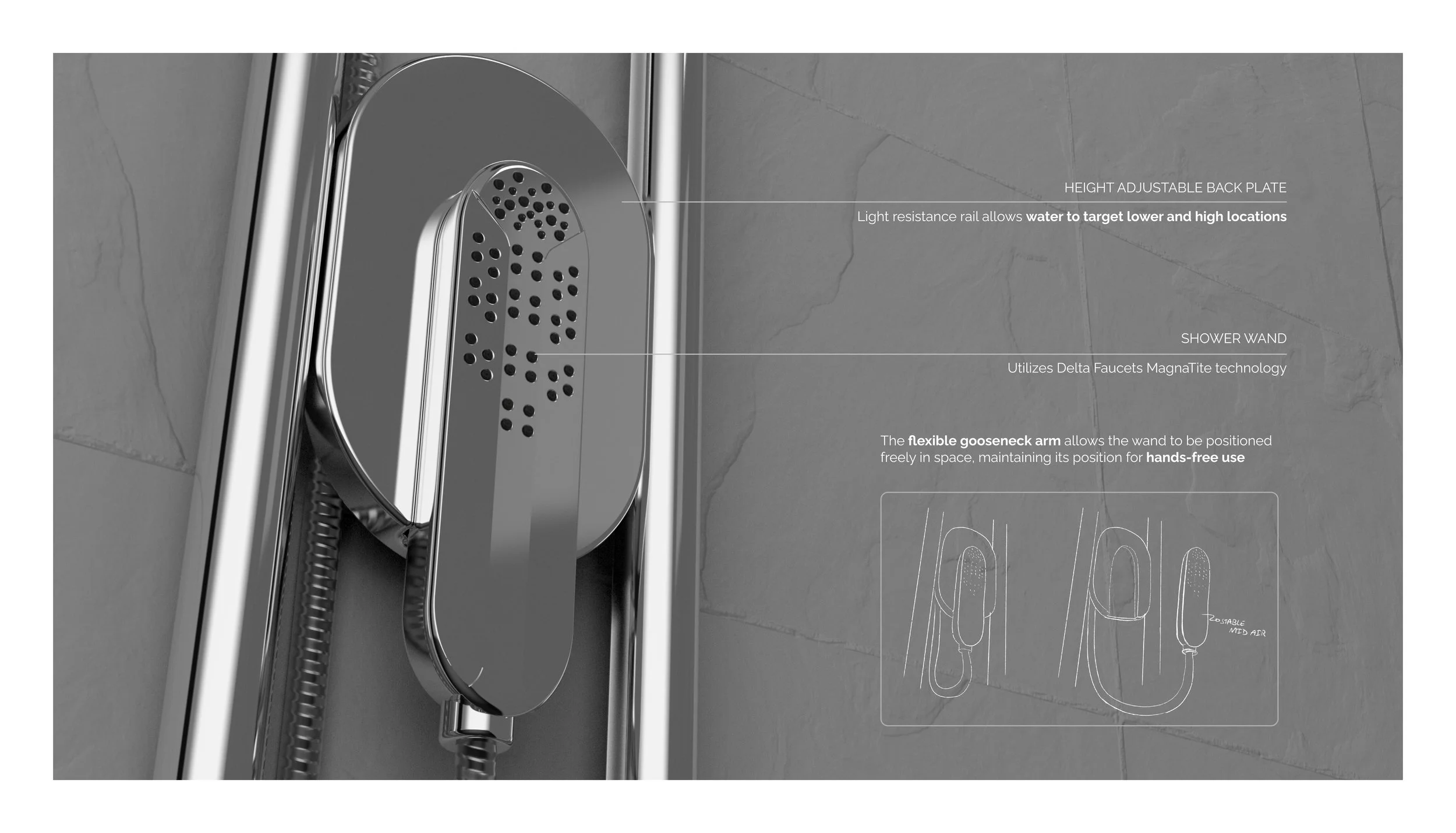 "I like that my showerhead has 6 different settings which gets water to target different parts of the body at different pressures"